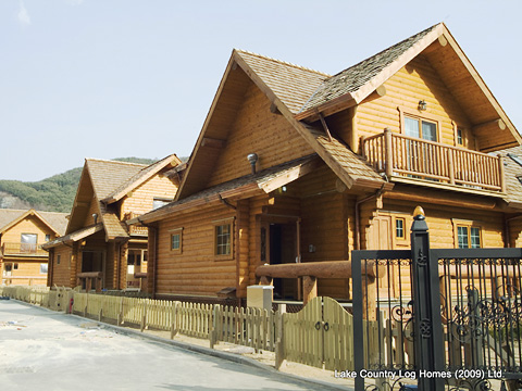 | マシンカットログで作られた大型コテージ15棟のリゾートです。リビングの上には大きな吹抜けが広がり、ハンドクラフトログによるルーフポストや135°の変形ノッチ、シダーシェイクの屋根など個性的な仕上がりとなっています。 合計15棟が湖に面して建っています。 |