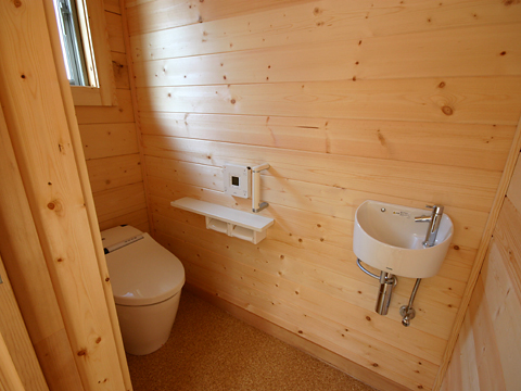 無垢材のログなのに壁面にクラックがほとんどないのが自慢です。 玄関を開けると大きく広がる吹抜けのスペースはログハウスならではの太い無垢の木に囲まれた気持ちのいい空間。リビングスペースにはアクセントのハンドカットログの大黒柱がそびえています。 |