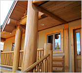 ポストや手すりにはハンドカットログをあしらってあるためハンドカットの雰囲気を醸し出しています。 このようなログの使い方はレイクカントリーログホームズならではの特色です。 |